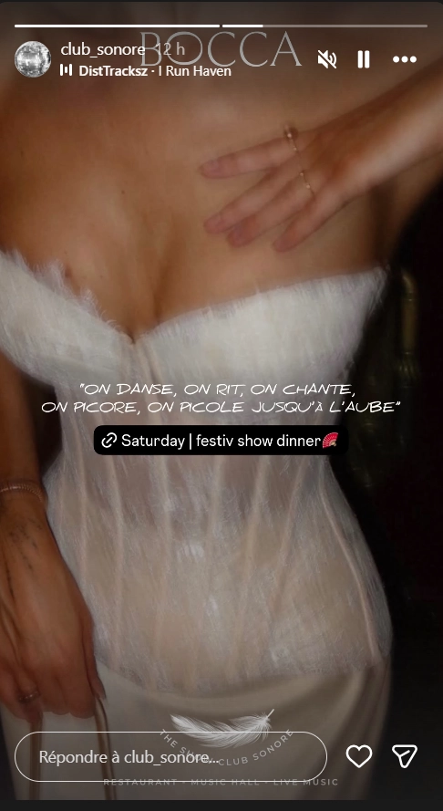 Le show est hosté par Olivia & Anthony, un duo qui incarne cette rencontre entre l’énergie Club Sonore et l’univers Bocca Nissa. Une création qui conserve l’ADN Club Sonore tout en le glissant dans l’élégance d’un cabaret contemporain.