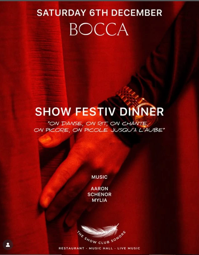 Chaque samedi, de 19h00 à 01h00, le cabaret Bocca Nissa accueille ce format hybride « Restaurant – Music Hall – Live Music » où l’on danse, on rit, on chante et on partage une ambiance glamour combinant spectacle, musique et esprit club.